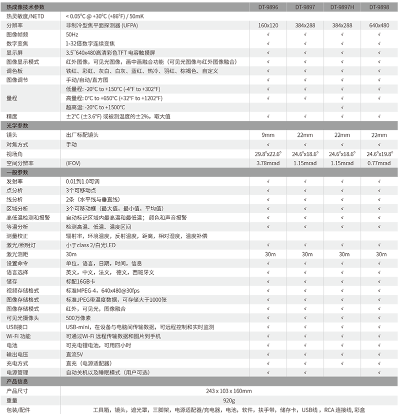 CEM DT-9897H系列高端工业智能型红外热像仪是CEM推出的160*120、384*288、640*480高端型红外热像仪系列产品。分辨率覆盖范围广、高温度量程可选、具有AUF融合功能、WIFI和激光测距功能,是电力巡检与维护、石化冶炼、环保等领域所需的红外热像仪工具。