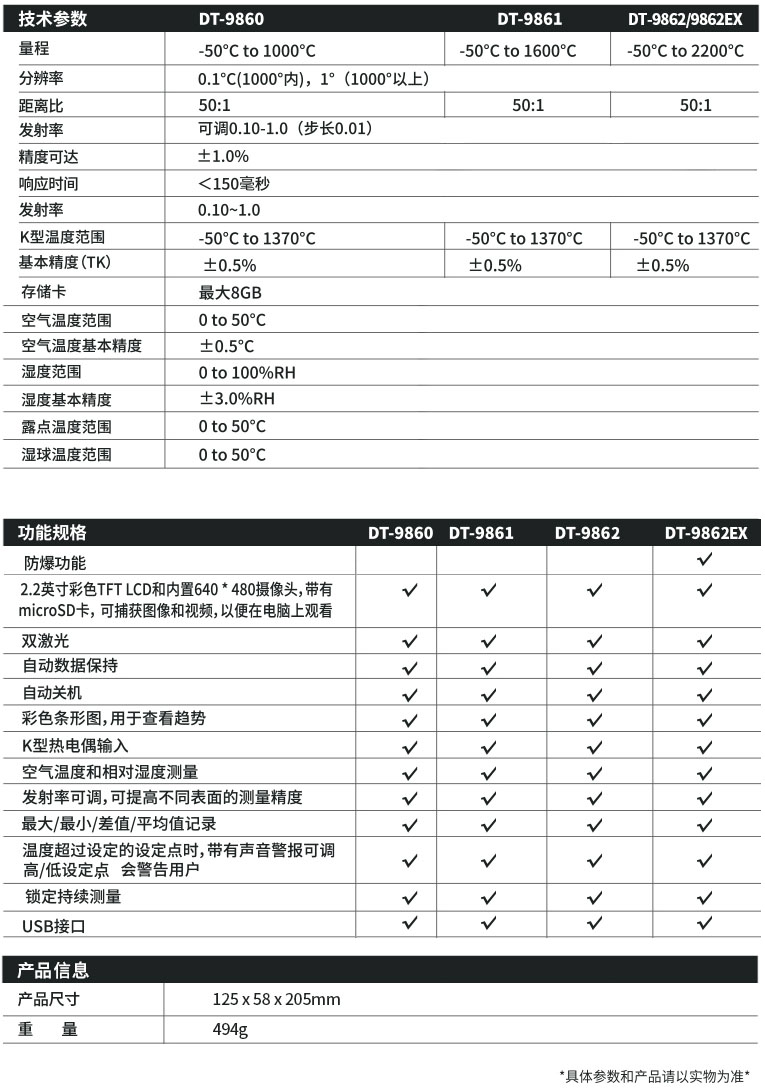 DT-9860/9861/9862/9862EX是CEM华盛昌新推出的红外摄温仪产品,该产品基于非接触式红外测温技术,可测量红外温度,从而从一个安全距离测定温湿度。该产品具有专利权的视频和照片拍摄功能,并配备了2.2”的彩色TFT液晶屏,可以让您的红外测温的工作更直观和高效。